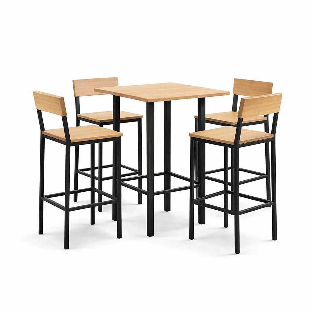 Bar set aus holzoptik und metall mit tisch und stühlen