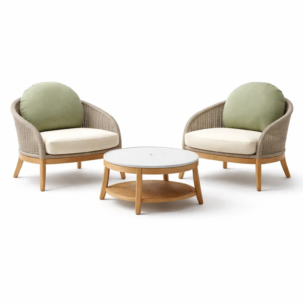 Loungemöbel-Set aus holz und geflecht mit kissen und tisch