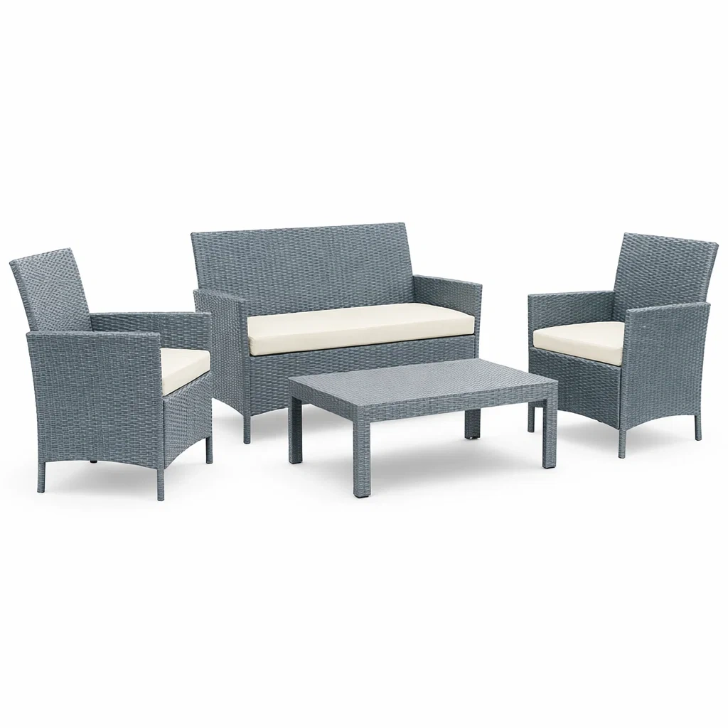 Sofa-set rattan grau mit cremefarbenen kissen
