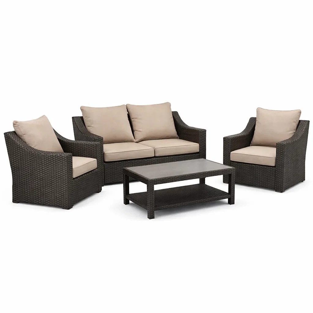 Sofa-set rattan braun mit beigen kissen sofa sessel tisch