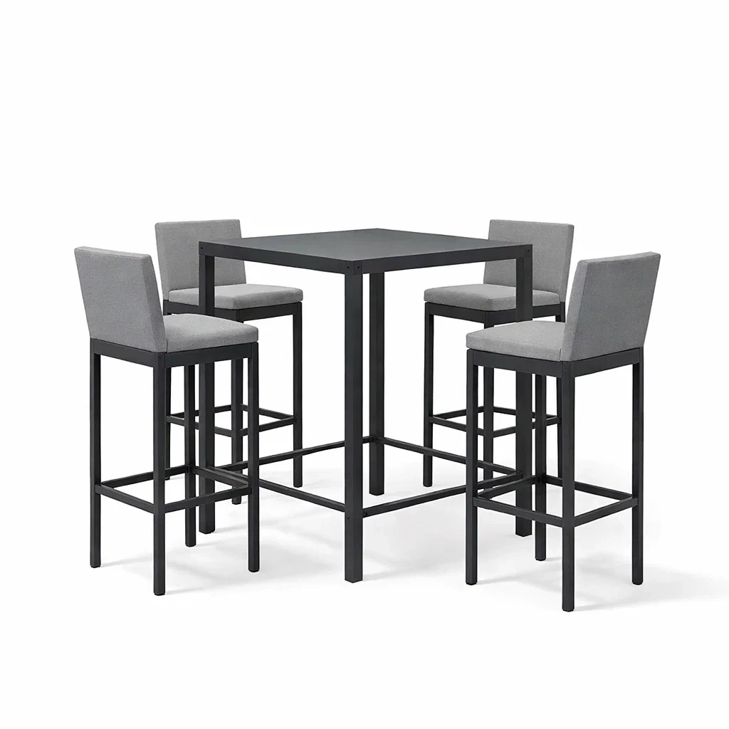 Dieses Set besteht aus einem Tisch und vier Hockern. Der Tisch ist aus pulverbeschichtetem Stahl gefertigt, die Hocker haben ebenfalls einen Stahlrahmen und sind mit Polyestergewebe bezogen.