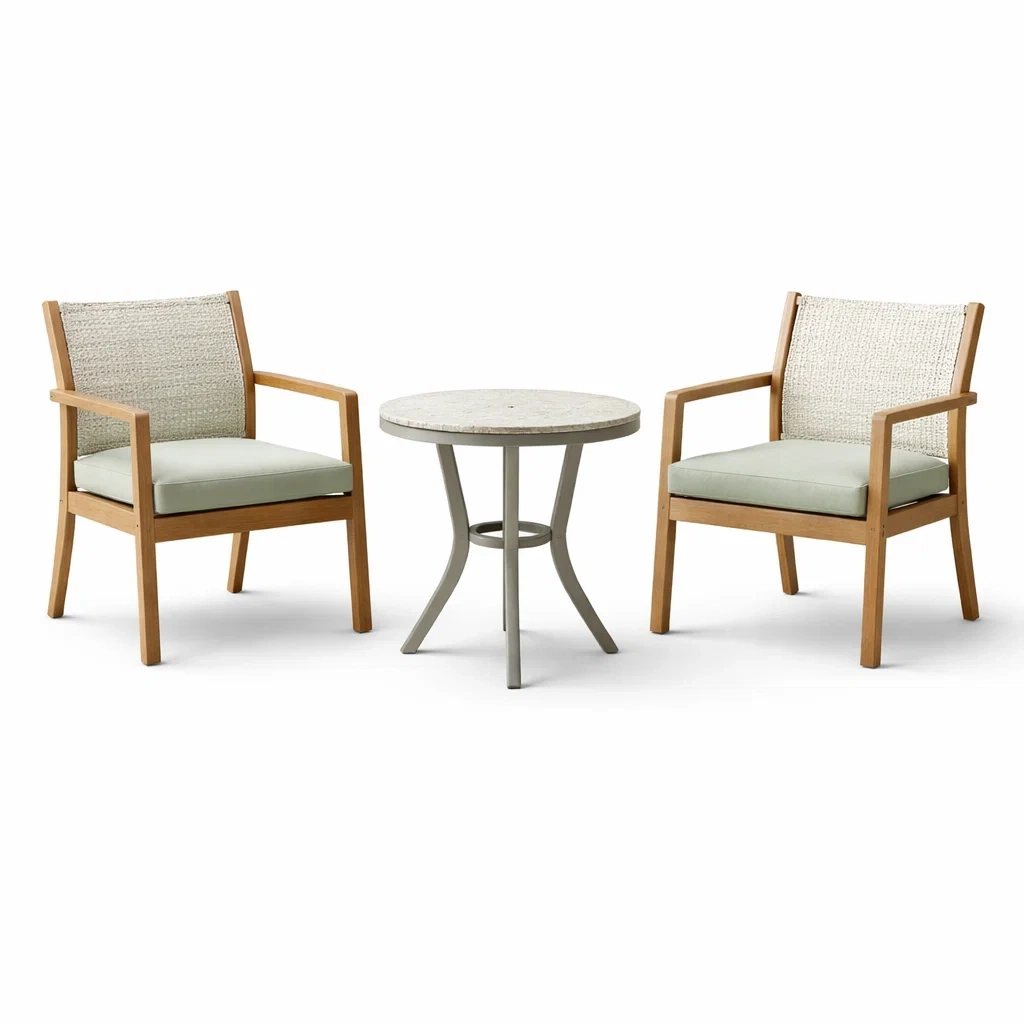 Das Gartenmöbel-Set umfasst zwei Sessel und einen Tisch.