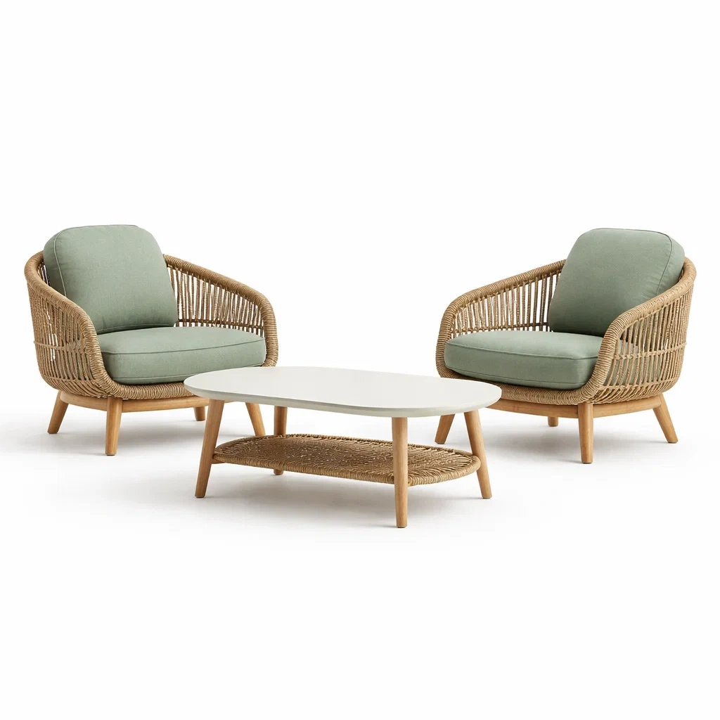 Materialien: Rahmen aus Teakholz, Sitz- und Rückenkissen mit Polyesterbezug, Tischplatte aus MDF, Geflecht aus Polyethylen.