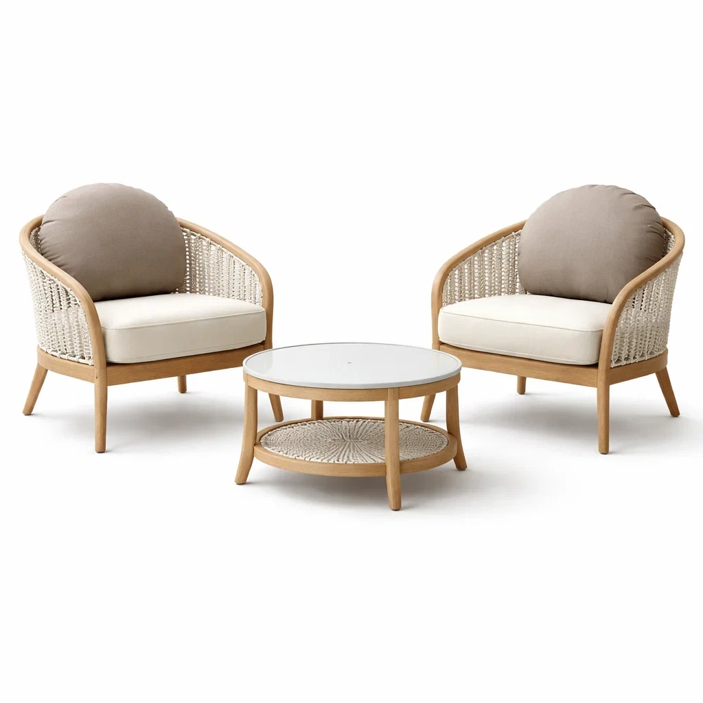 Material: Teakholz, Polyestergarn, Aluminium, gehärtetes Glas